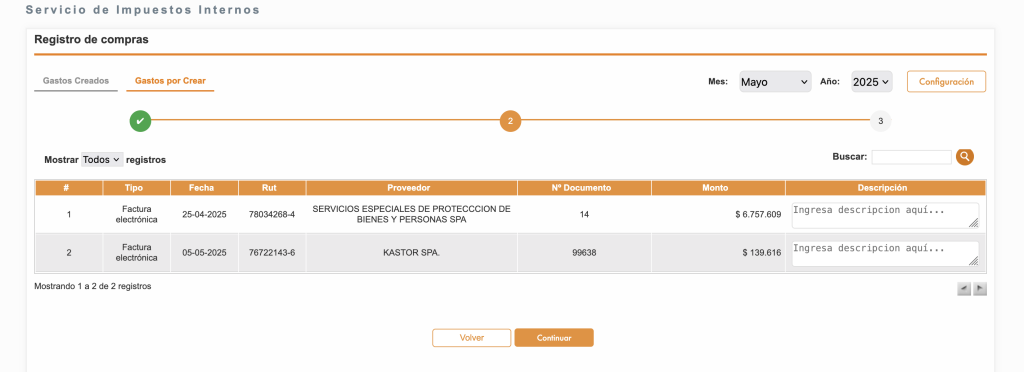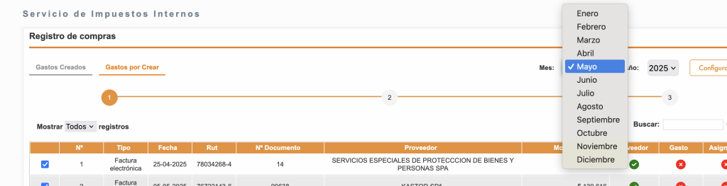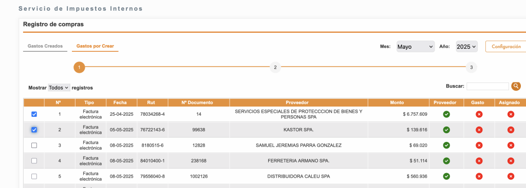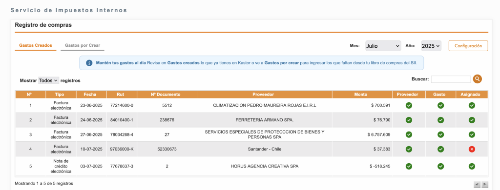 - Para consultar el Libro de compras y crear gastos en Kastor, ve a la sección Gastos por crear y hazlo en 3 simples pasos.