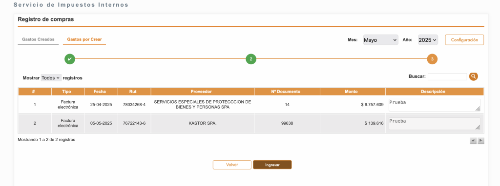 - Para finalizar, paso 3, asegúrate de que son los gastos y glosas correctas, si no lo son haz clic en Volver para corregir, y si son correctos haz clic en Ingresar.