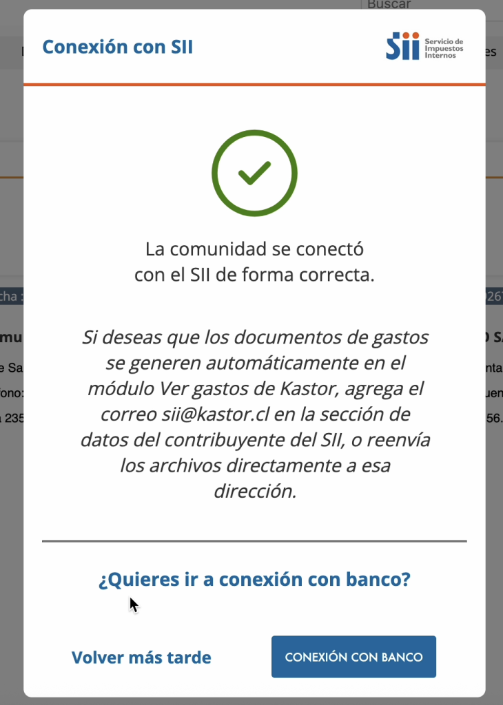 Recuerda que Kastor cuenta con las certificaciones de seguridad necesarias para garantizar la confidencialidad de tus datos. - Una vez que la contraseña ingresada se valida con el SII, el sistema te informa que la conexión es exitosa, y te indica cuál es la casilla de correo que puedes utilizar si deseas que los documentos de facturas se carguen de forma automática en el gasto correspondiente.